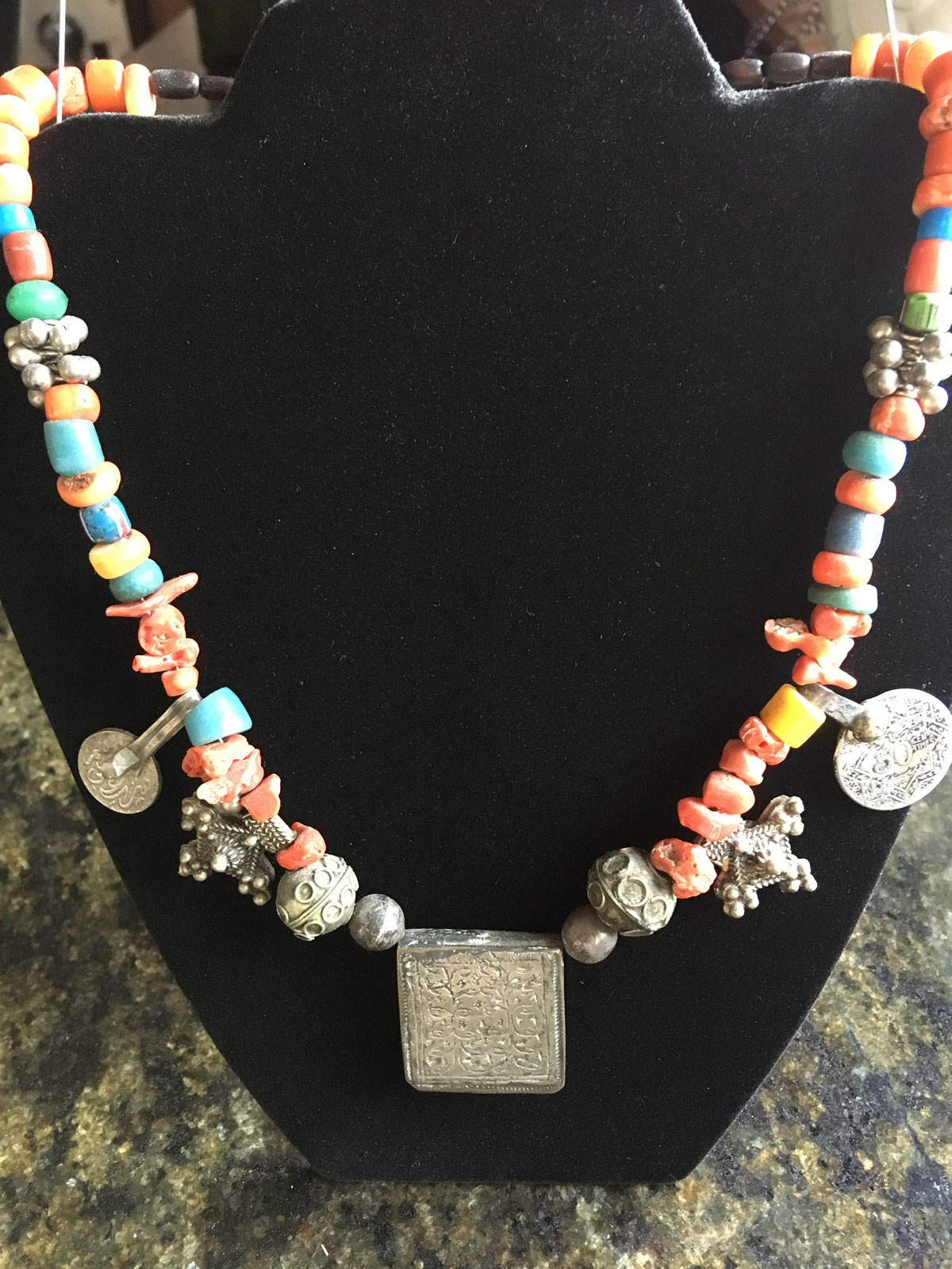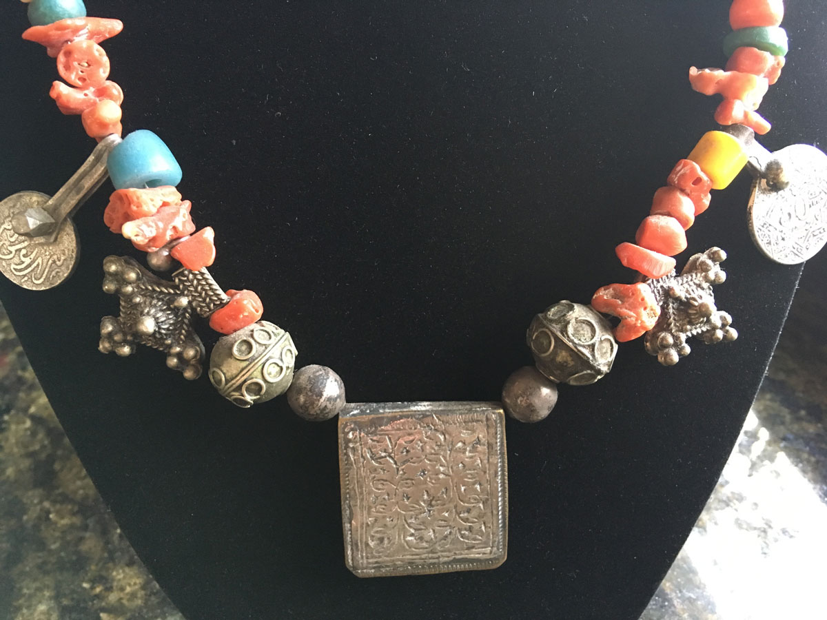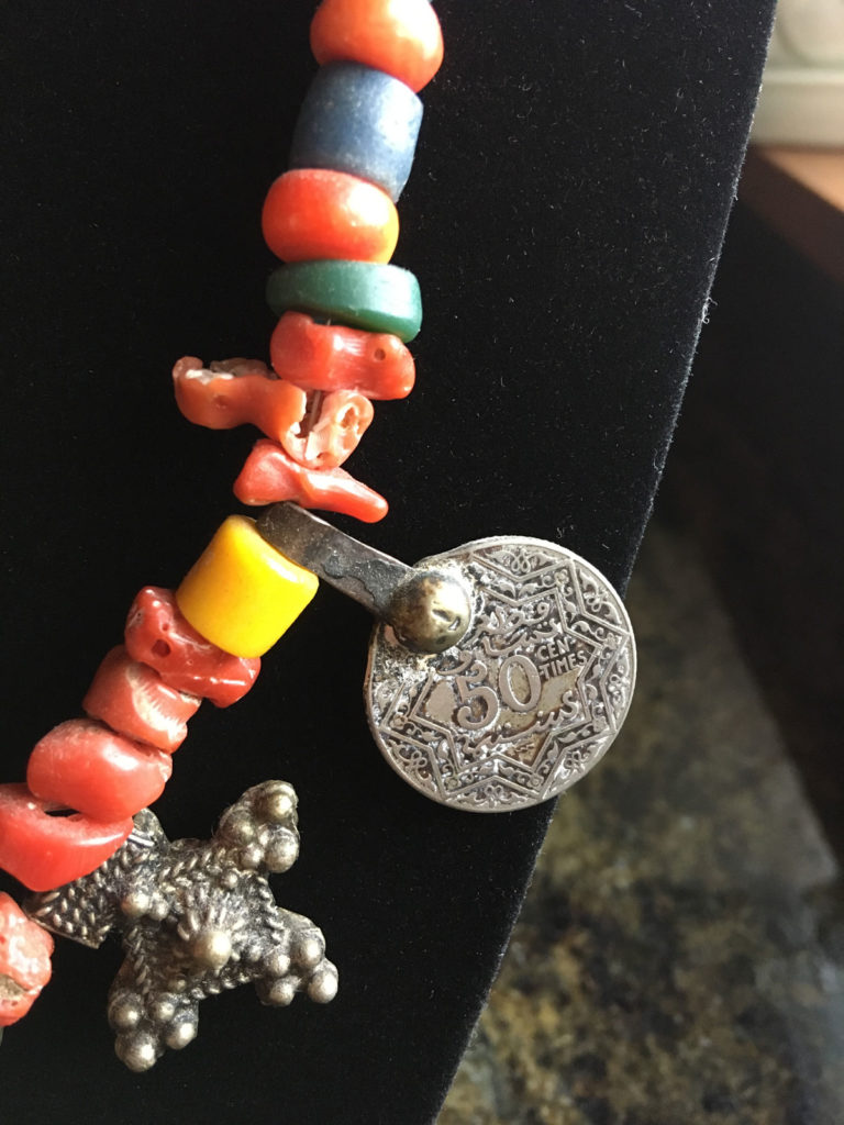 Antique Silver Talisman, Antique Moroccan Coral, Antique Glass, Pewter, Seeds